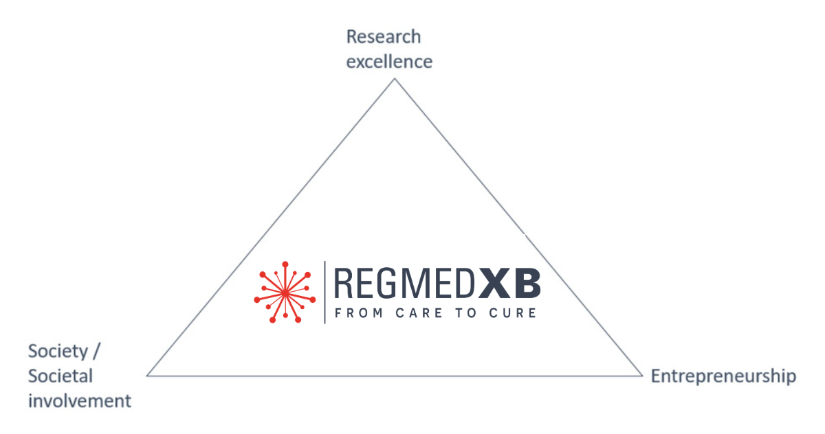 The educational plan targets three important areas: research excellence, society and entrepreneurship (Fig.2). The plan consists of a list of courses, seminars and workshops, which increases the understanding between these areas. The courses are open for every person within RegMedXB and the goals differ per pillar. For example, a researcher can choose a research specific course, which will help with their work in the Moonshot and further their scientific abilities/career. But he or she may also wants to participate in a course on Intellectual Property (IP & valorization) or attend a workshop on how to involve expert patients or interact with the public. Our ambition is to foster interaction between all three areas. Patients and the public are invited to discover more about RegMed XB and have discussions with researchers about the societal impact on an annual basis.
