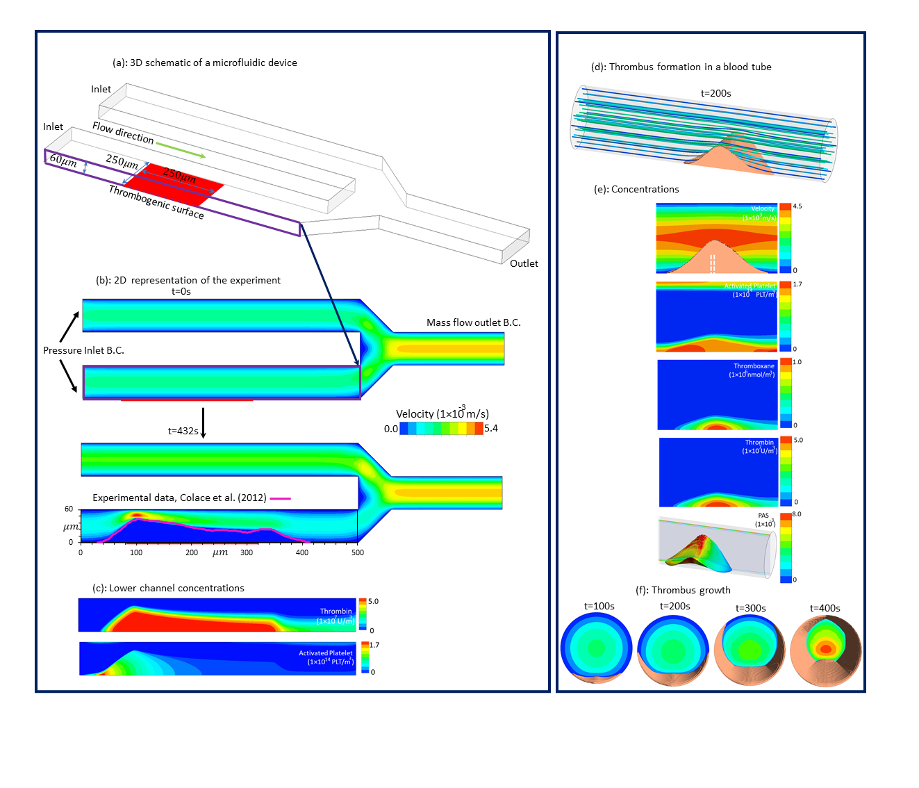 The aim of their study was to introduce a novel computational scheme using a continuum model of thrombus formation. They validated the results with in-vitro experiments of a microfluidics chamber, both spatially and temporally. They also simulated thrombus formation in a blood vessel and showed that their results for 3D arbitrary domains are quite promising. This newly developed model will enable the prediction of sites that are prone to thrombus formation under physiological and pathological conditions.