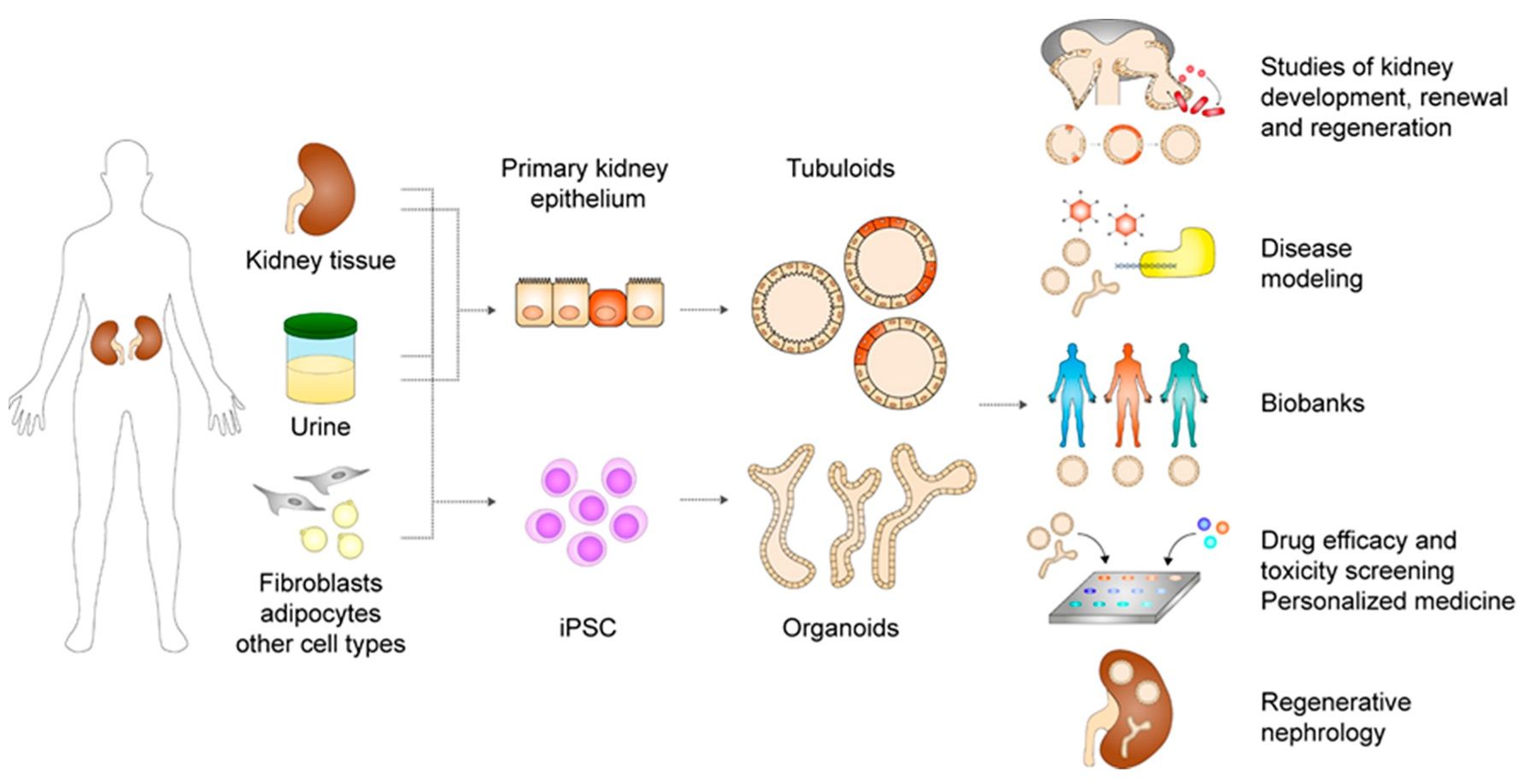 The development of organoids and tubuloids opens a window to a wide array of new possibilities for fundamental research and medicine, by elevating scientists' understanding of kidney development, renewal, and repair processes. The fact that these organoids and tubuloids (also referred as “mini-kidneys”) are able to mimic in-vivo environments offer the researches a wide range of opportunities, like modeling developmental diseases, better comprehend congenital disorders, or test and predict the efficacy of novel treatments; at the same time that allows to carry out studies using human tissue in contrast to animal models.