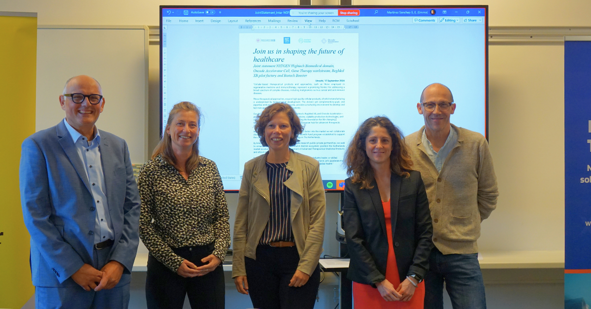 Utrecht (The Netherlands), September 17th, 2024. At a joint event at the Innovation Center for Advanced Therapies (ICAT) on the Utrecht Science Park Zeist, representatives from four pioneering consortia supported by the Dutch National Growth Fund—NXTGEN Hightech, RegMed XB, Biotech Booster, and Oncode Accelerator— met to share their accomplishments to date and future plans. They also identified key areas for collaboration, and the productive day resulted in the drafting of a joint statement as well as a call for new partners.